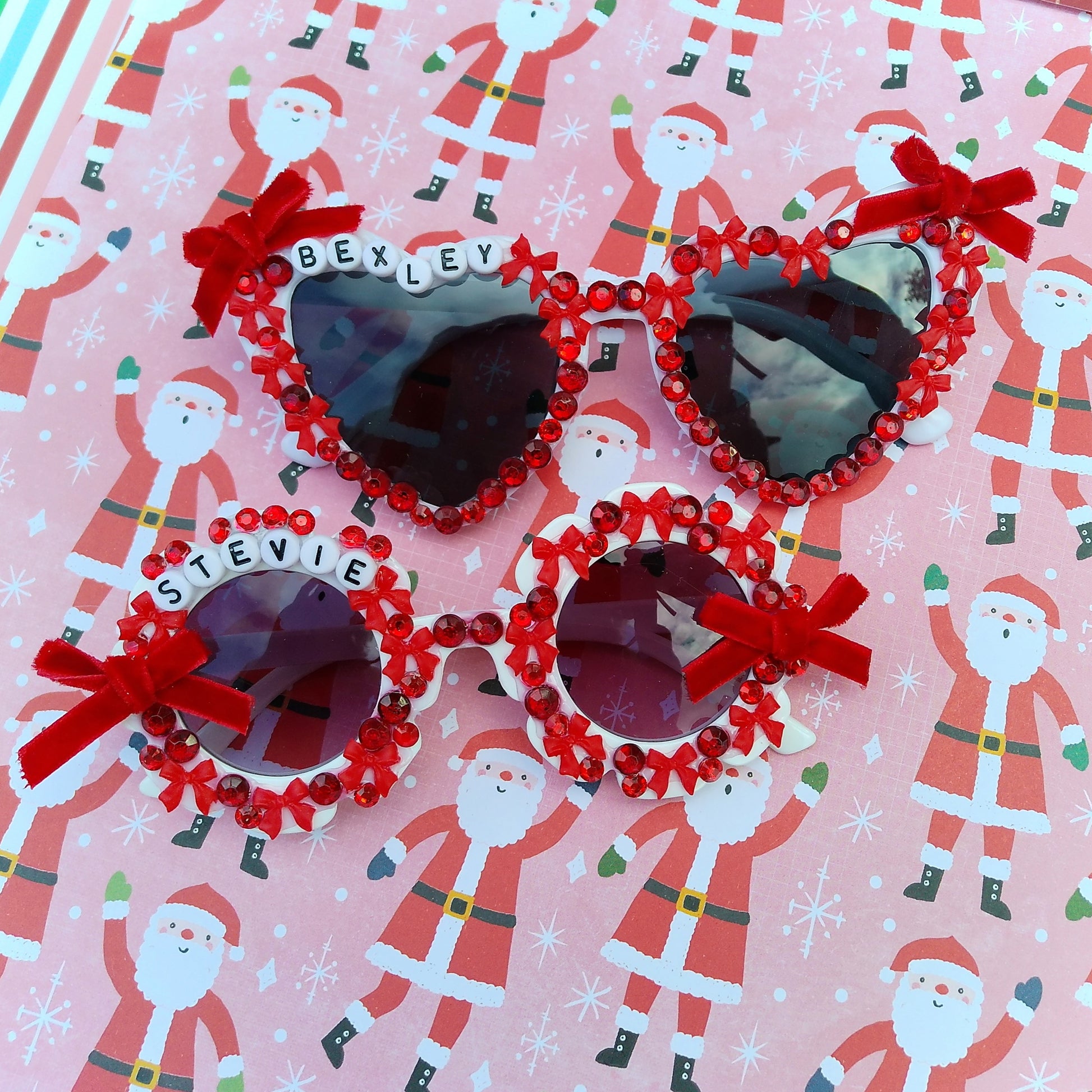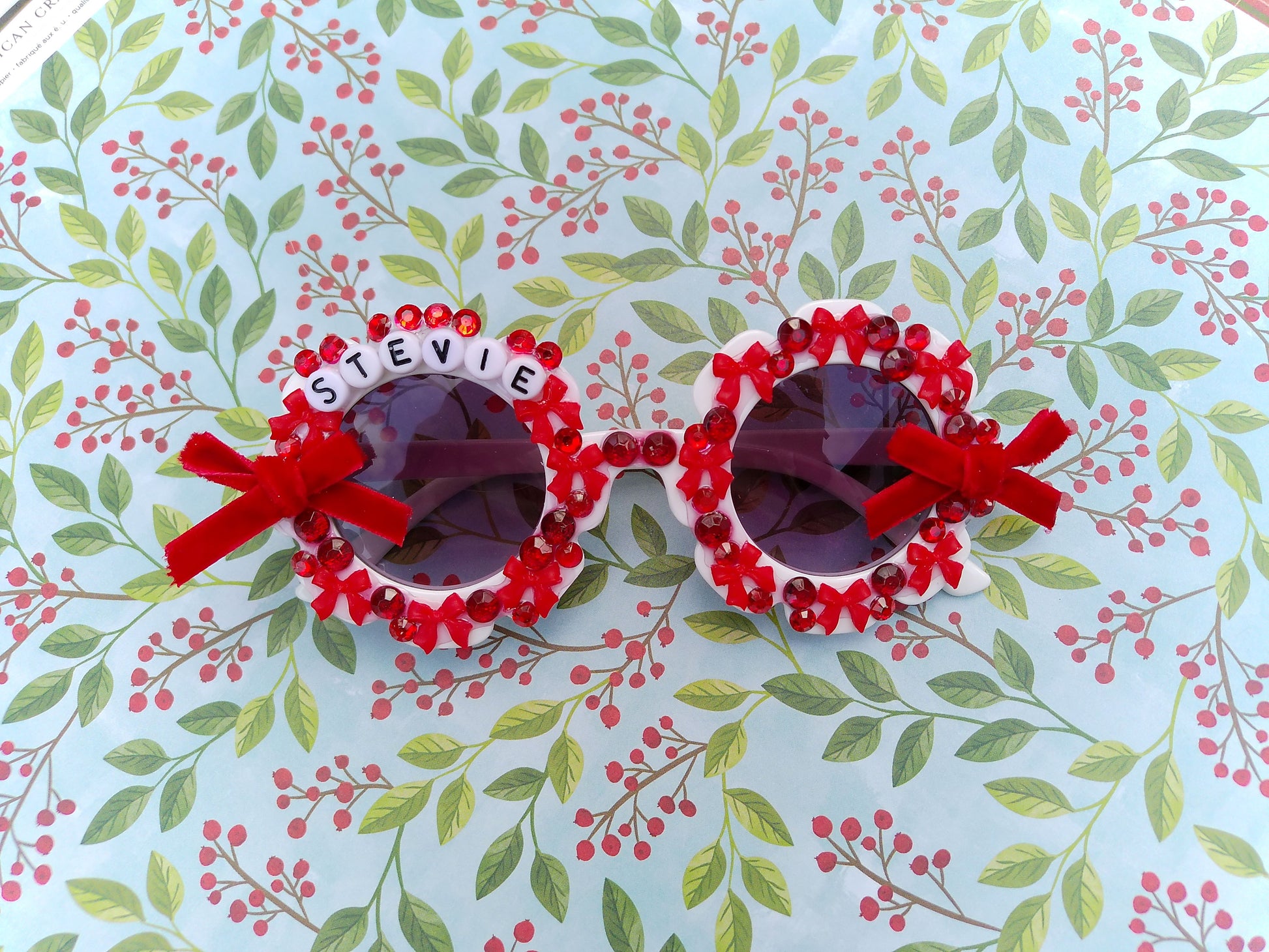 Bow on Top! The perfect finishing touch for a festive look! These white and red personalized sunglasses feature a cheerful bow charm that adds a pop of holiday magic to any outfit. Ideal for holiday photos, tree decorating, or spreading Christmas cheer wherever you go!