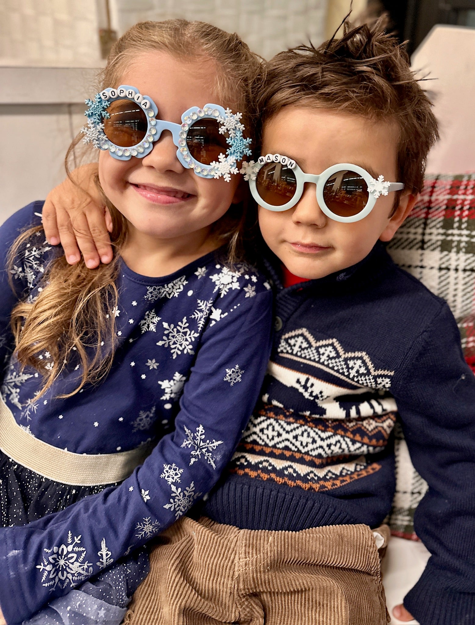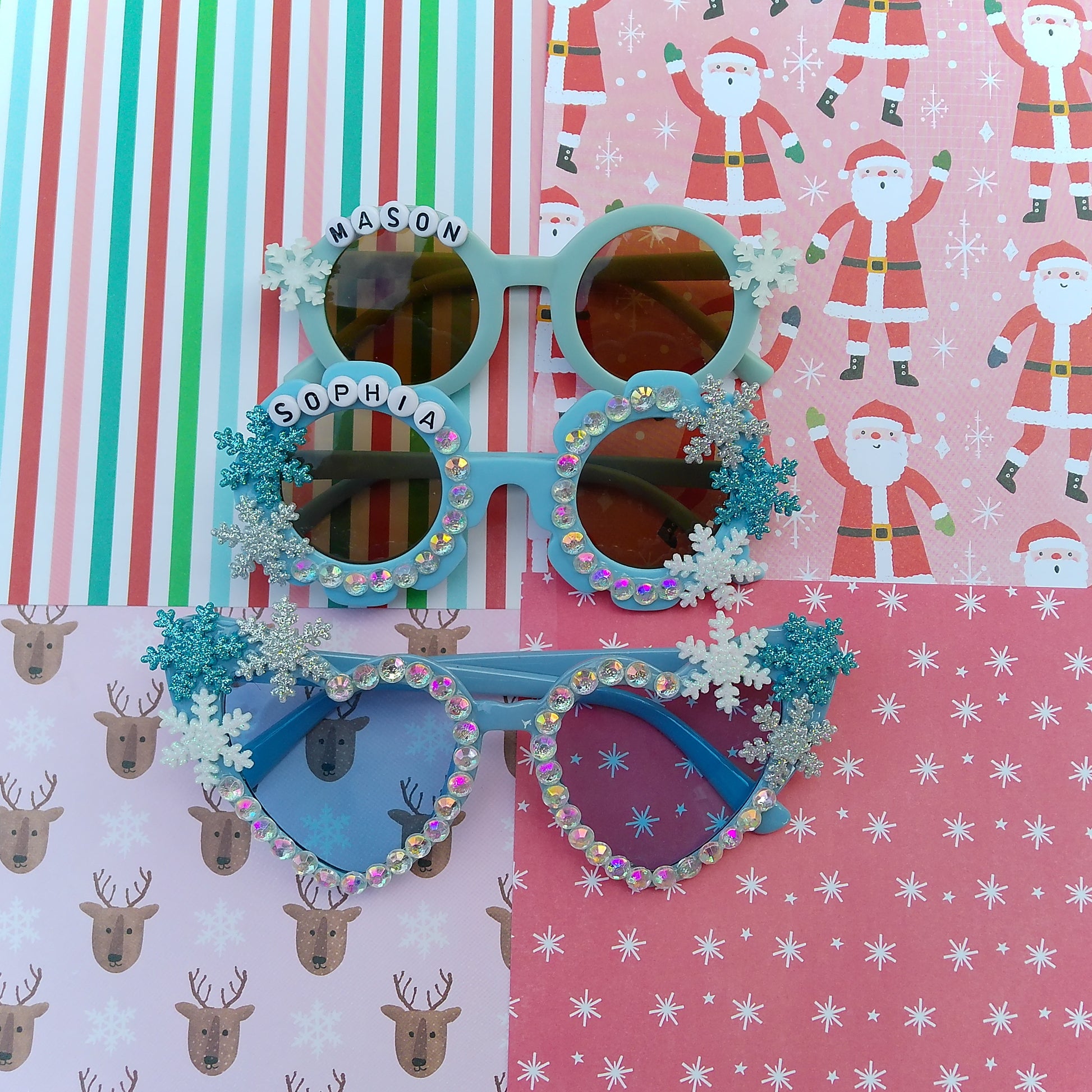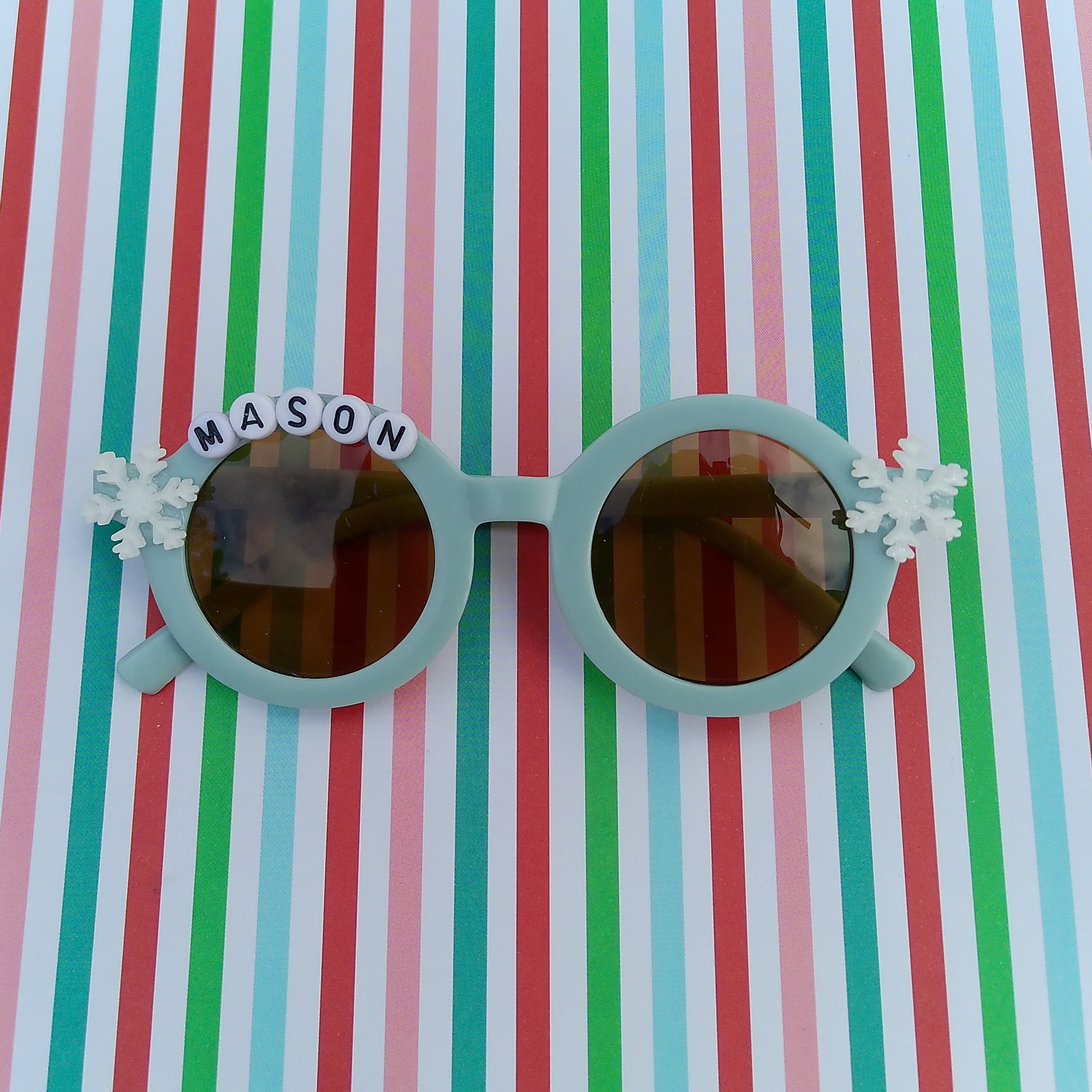 Snow Much Fun! Bring on the chill! These icy-blue personalized sunglasses sparkle with snowflake charms and winter magic. Perfect for snow days, holiday strolls, or twirling through a winter wonderland—because frosty days deserve extra sparkle!
